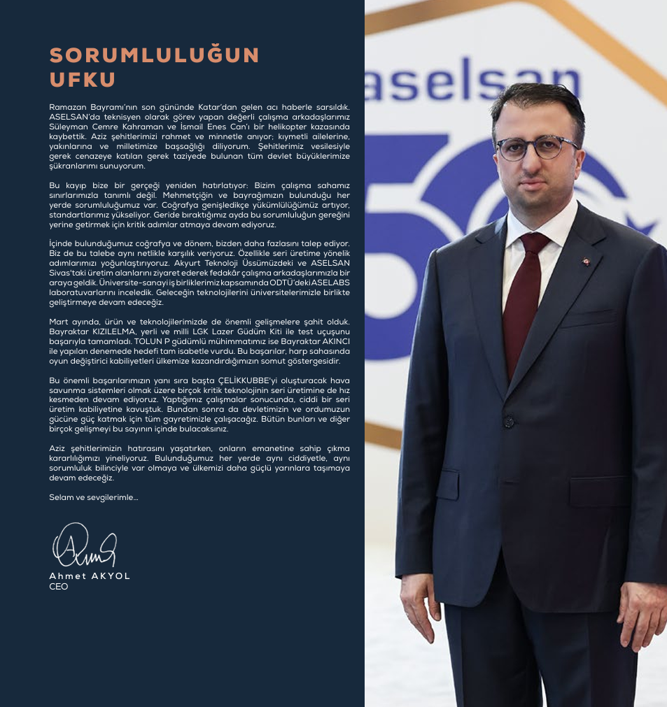 ASELSAN Genel Müdürü Ahmet Akyol, Bültende yer alan “SORUMLULUĞUN UFKU” başlıklı yazısında, Ramazan Bayramı’nın son gününde Katar’dan gelen acı haberle sarsıldıklarını; ASELSAN’da teknisyen olarak görev yapan çalışma arkadaşları Süleyman Cemre Kahraman ve İsmail Enes Can’ı bir helikopter kazasında kaybettiklerini hatırlattı.
