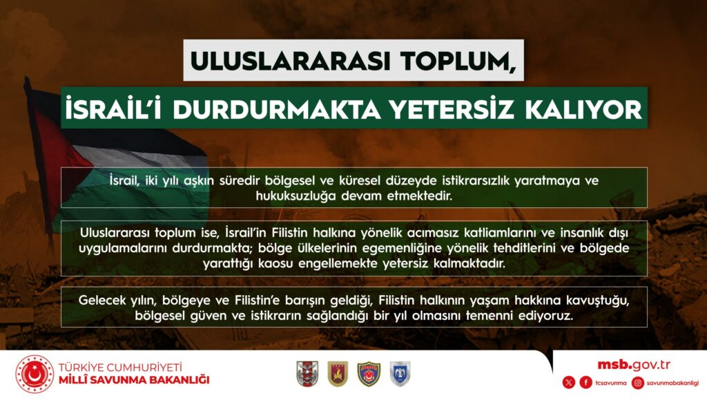 Gelecek yılın, bölgeye ve Filistin’e barışın geldiği, Filistin halkının yaşam hakkına kavuştuğu, bölgesel güven ve istikrarın sağlandığı bir yıl olmasını temenni ediyoruz.