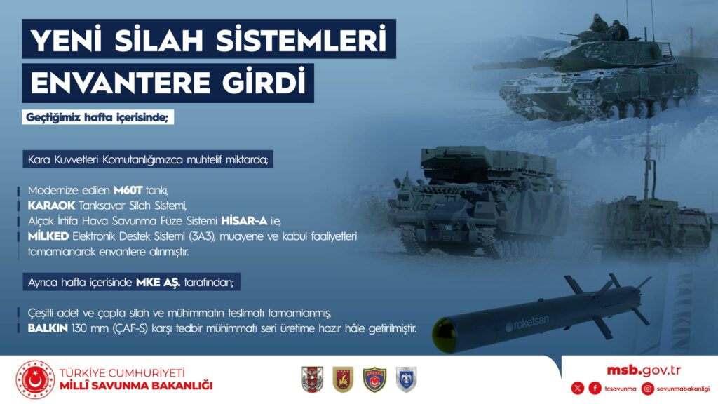 Türk Silahlı Kuvvetlerimizin güçlü, modern ve etkin savunma kapasitesinin yerli ve millî savunma sanayi ürünlerimizle geliştirilmesi çalışmalarına da devam edilmektedir. Geçtiğimiz hafta içerisinde;