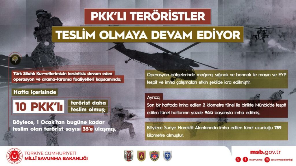 – Hafta içerisinde 10 PKK’lı terörist daha teslim olmuş; böylece, 1 Ocak’tan bugüne kadar teslim olan terörist sayısı 35’e ulaşmış,