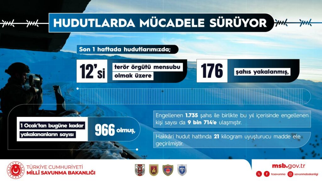 – 12’si terör örgütü mensubu olmak üzere 176 şahıs yakalanmış, 1 Ocak’tan bugüne kadar hudutlarımızdan yasa dışı yollarla geçmeye çalışırken yakalananların sayısı 966 olmuş,