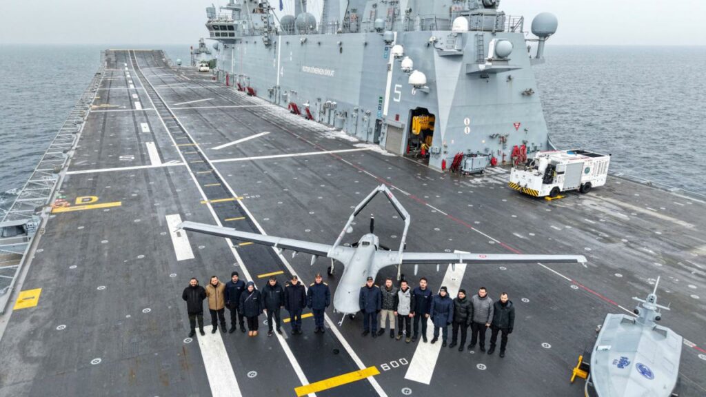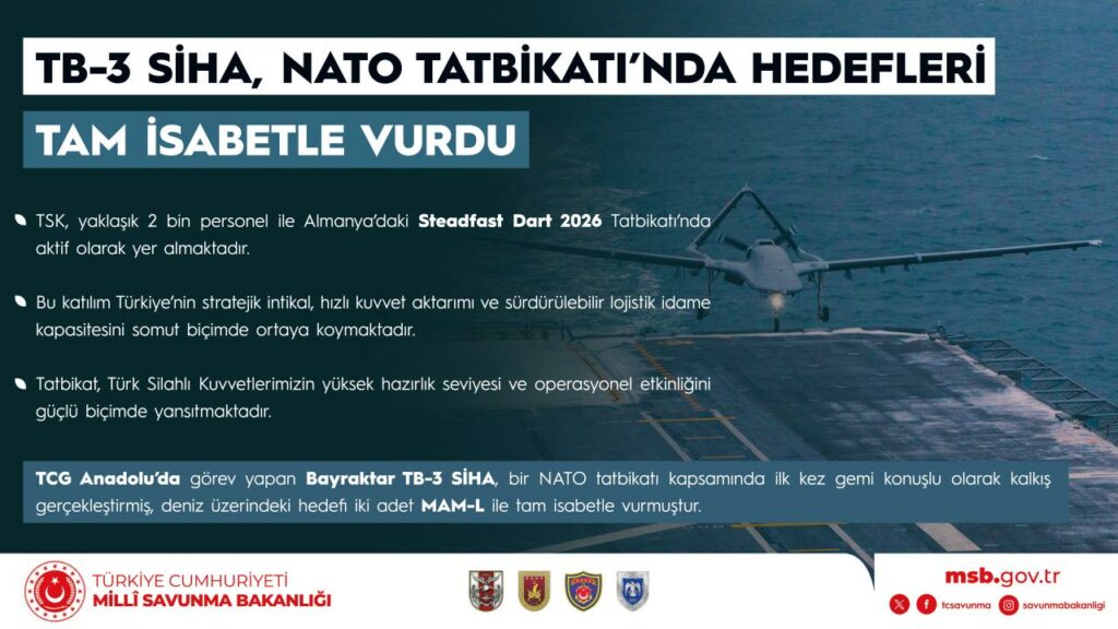 Bu çerçevede, 14 Şubat’ta TCG Anadolu’da görev yapan Bayraktar TB-3 Silahlı İnsansız Hava Aracı, bir NATO tatbikatı kapsamında ilk kez gemi konuşlu olarak kalkış gerçekleştirmiş, deniz üzerindeki hedefi iki adet Mini Akıllı Mühimmat (MAM-L) ile tam isabetle vurmuştur.