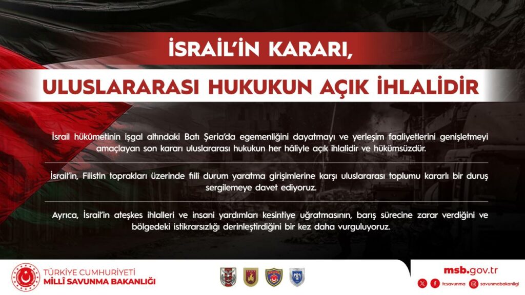 İsrail hükûmetinin işgal altındaki Batı Şeria’da egemenliğini dayatmayı ve yerleşim faaliyetlerini genişletmeyi amaçlayan son kararı uluslararası hukukun her hâliyle açık ihlalidir ve hükümsüzdür.