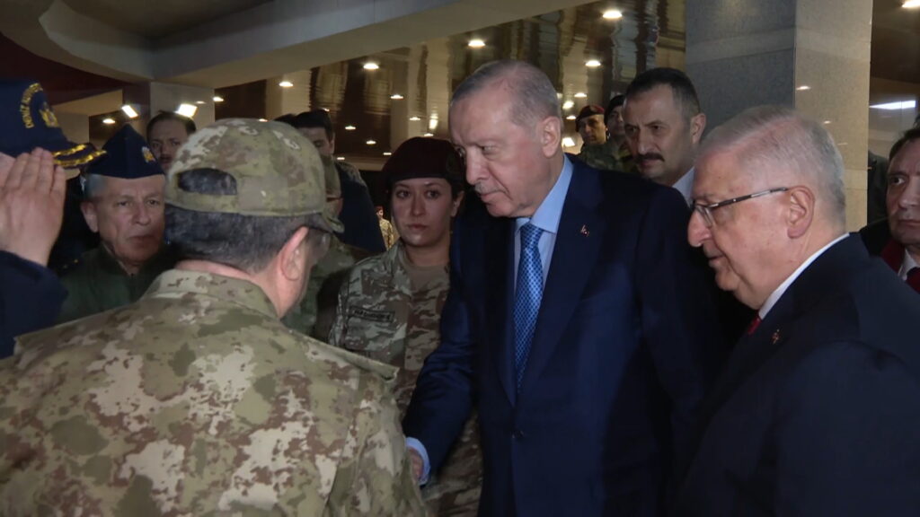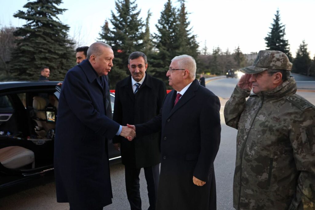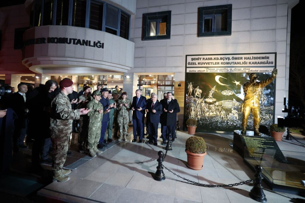 Beraberinde Cumhurbaşkanı Yardımcısı Cevdet Yılmaz ile Ankara Gölbaşı’ndaki Özel Kuvvetler Komutanlığına gelen Cumhurbaşkanı Erdoğan’ı Millî Savunma Bakanı Yaşar Güler askerî törenle karşıladı.
