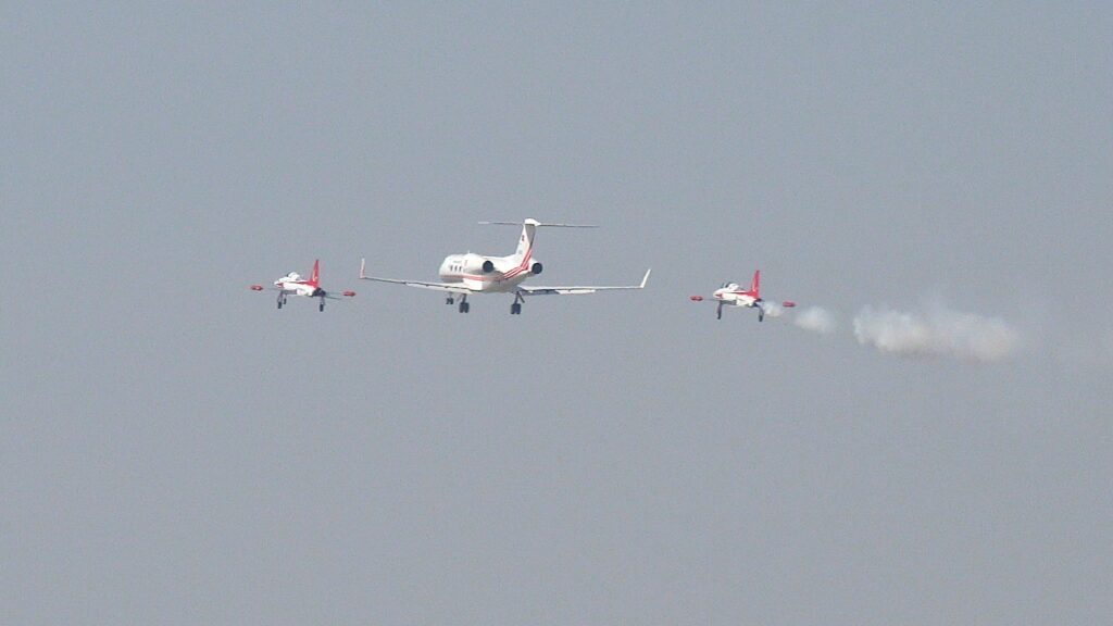 Orgeneral Bayraktaroğlu’nun içinde bulunduğu uçak 3’üncü Ana Jet Üssüne iniş yapmadan hemen önce Türk Yıldızları Hava Akrobasi ekibinden iki NF-5 uçağı, Orgeneral Bayraktaroğlu’nun bulunduğu uçağa havada bir süre eşlik etti.