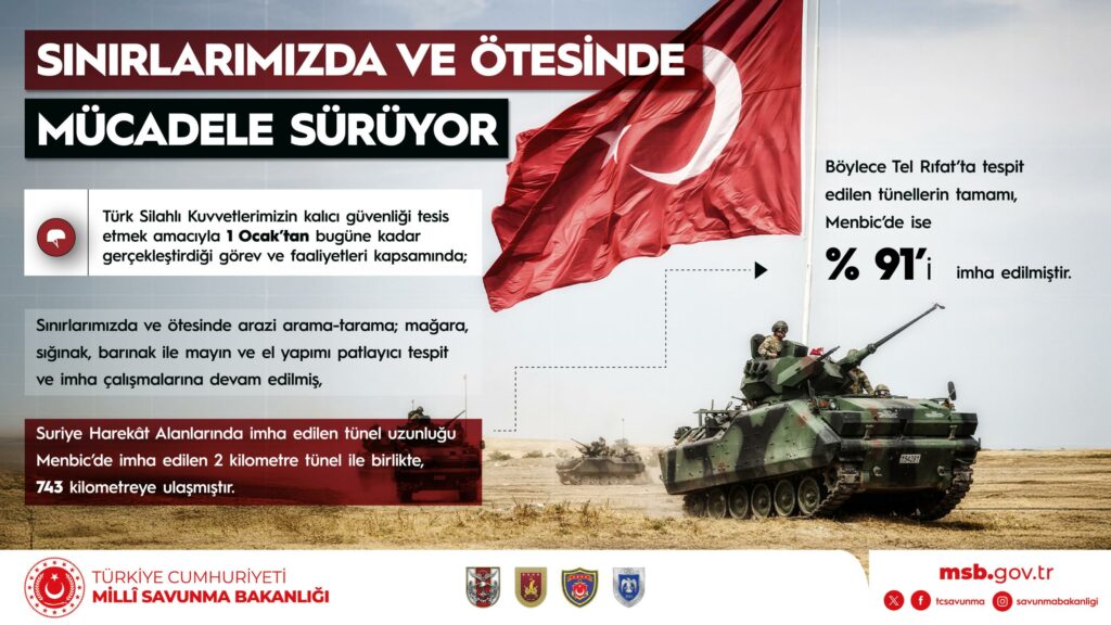 – Suriye Harekât Alanlarında imha edilen tünel uzunluğu Menbic’de imha edilen 2 kilometre tünel ile birlikte, 743 (Tel Rıfat: 302 / Menbic 441) kilometreye ulaşmıştır.