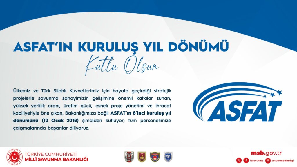 Ülkemiz ve Türk Silahlı Kuvvetlerimiz için hayata geçirdiği stratejik projelerle savunma sanayimizin gelişimine önemli katkılar sunan, yüksek yerlilik oranı, üretim gücü, esnek proje yönetimi ve ihracat kabiliyetiyle öne çıkan, Bakanlığımıza bağlı ASFAT’ın 8’inci kuruluş yıl dönümünü (12 Ocak 2018) şimdiden kutluyor; tüm personelimize çalışmalarında başarılar diliyoruz.