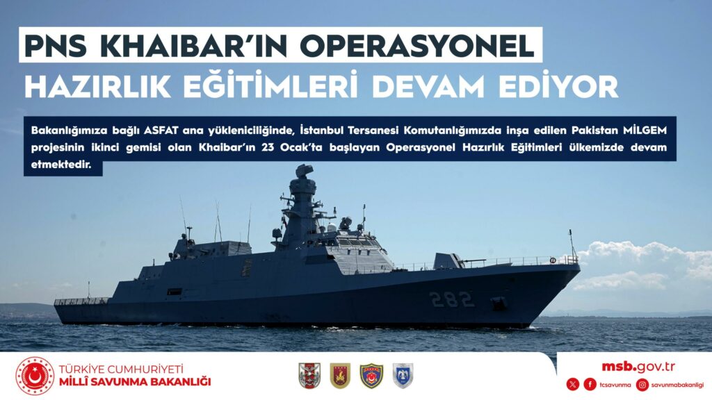 Değerli Basın Mensupları, Bakanlığımıza bağlı ASFAT ana yükleniciliğinde, İstanbul Tersanesi Komutanlığımızda inşa edilen Pakistan MİLGEM projesinin ikinci gemisi olan Khaibar’ın 23 Ocak’ta başlayan Operasyonel Hazırlık Eğitimleri ülkemizde devam etmektedir.