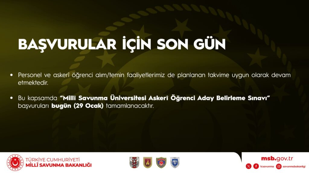 Bu kapsamda “Millî Savunma Üniversitesi Askerî Öğrenci Aday Belirleme Sınavı” başvurusu bugün (29 Ocak) tamamlanacaktır.
